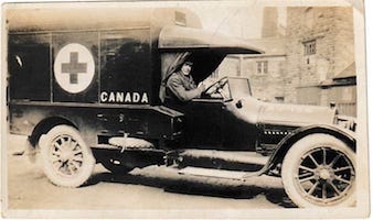 George then traveled with the CEF to Great Britain and was deployed as a truck driver during the war. My Australian cousin kindly sent me a picture of him driving a Canadian Red Cross lorry. My family had no pictures of him to my knowledge.